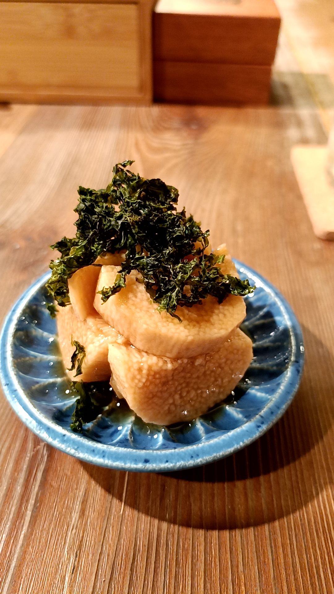 お通しは5つの内から1つを選べます。どれを選ぶかかなり迷いました。私が選んだのは「そば豆腐」。蕎麦粉と水を混ぜてから火にかけて作った練り豆腐で、白わさびとごま油醤油でいただきます。小麦から作られる久寿餅と食感が似ていました。