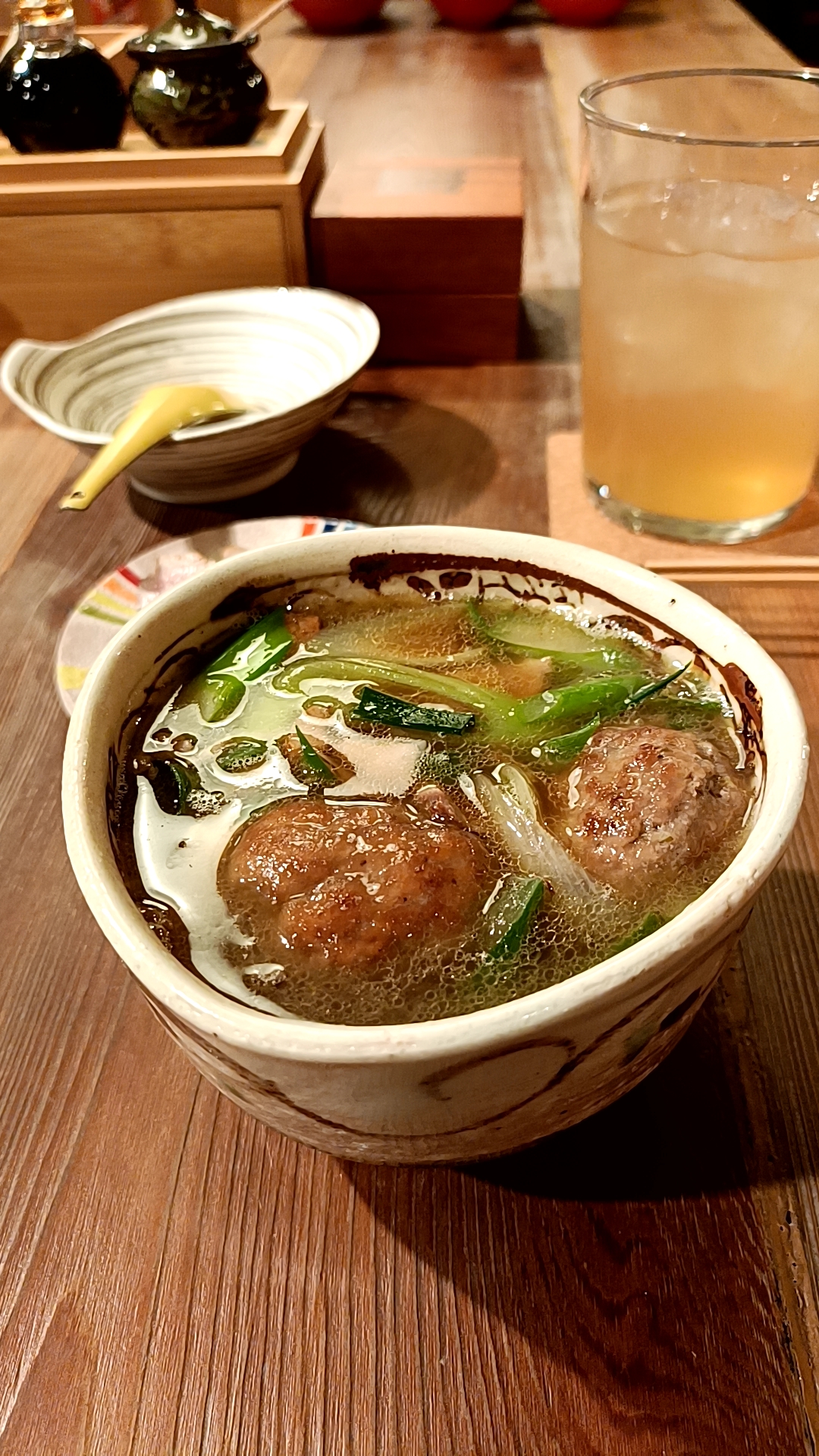 鴨のつくね、もも肉と九条ネギを炒めてかけ汁で煮ています。別で鴨ロースがついてくるお得なメニュー。